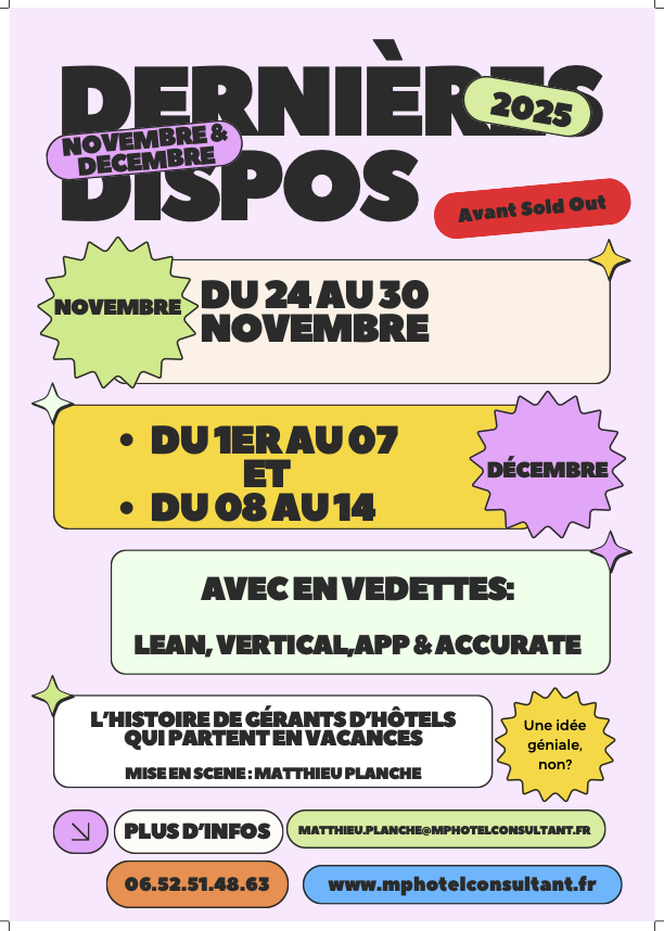 A compter du 1er Août 2025, nouvel email de contact. Merci de m'envoyer vos demandes ou contrat signé à matthieu.planche@mphotelconsultant.fr